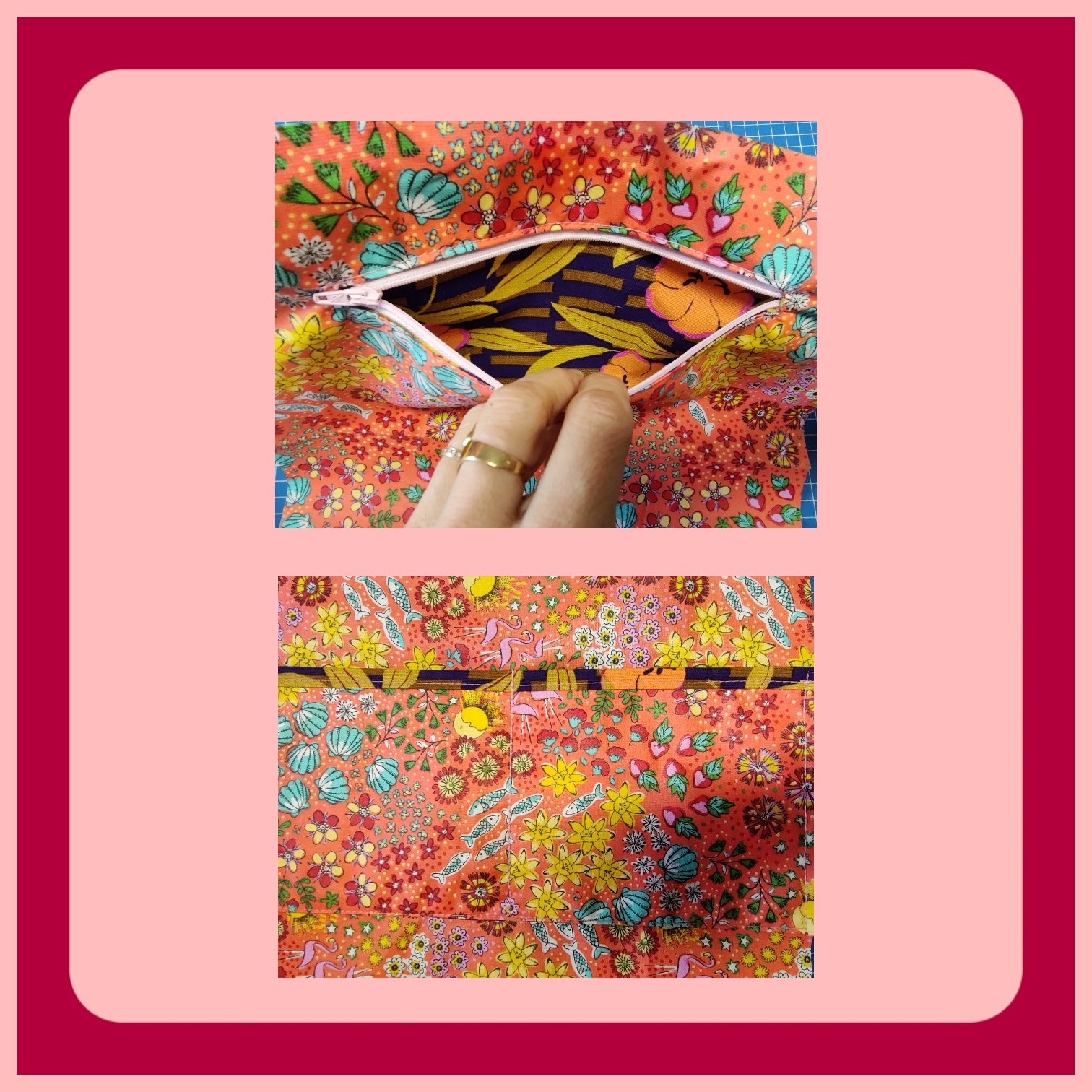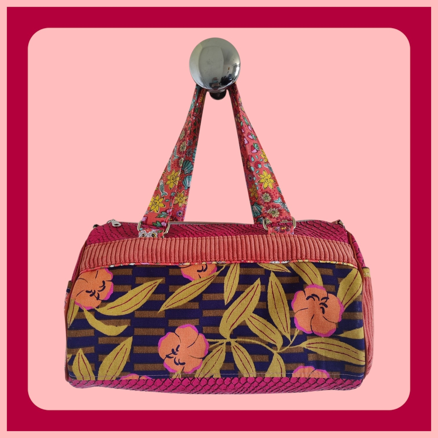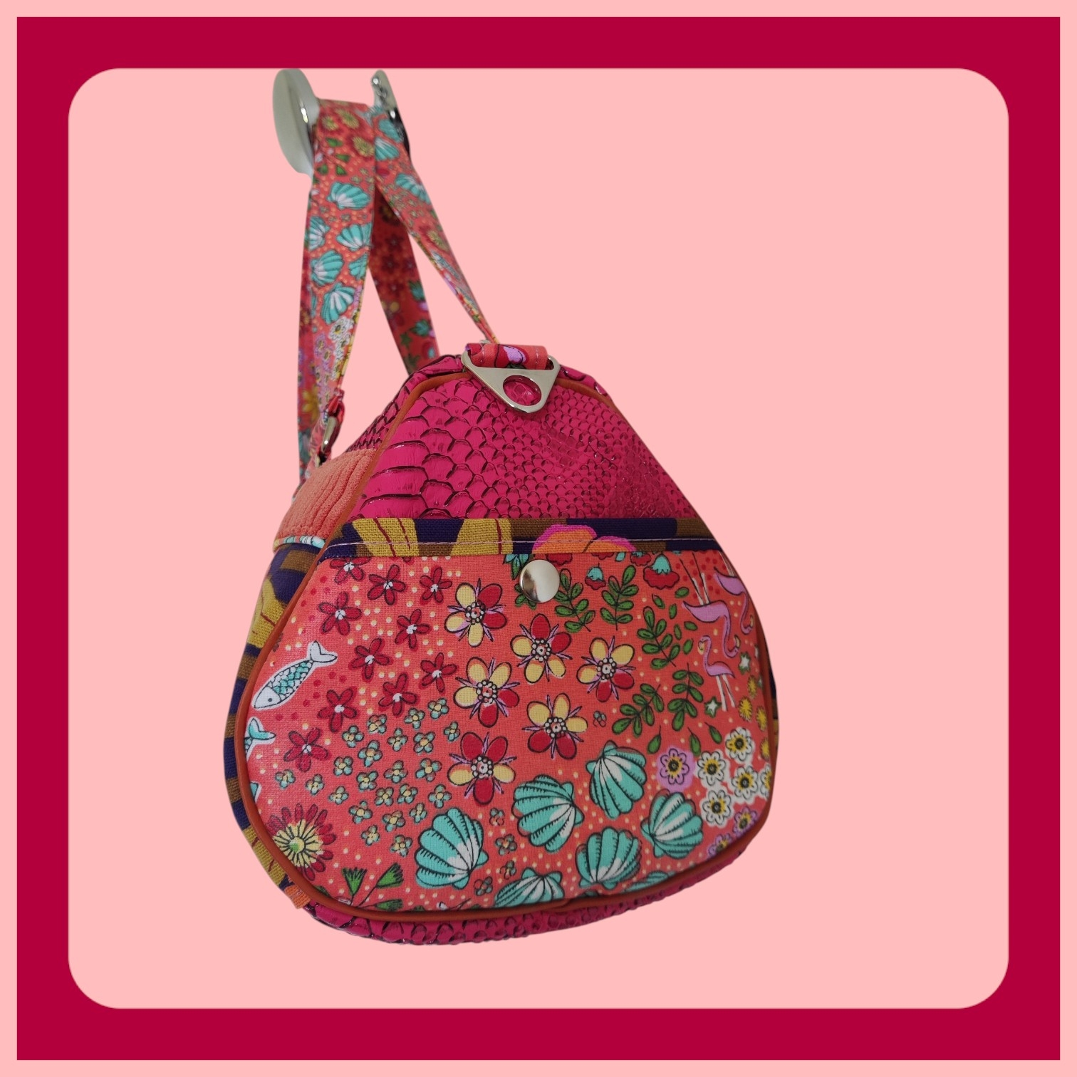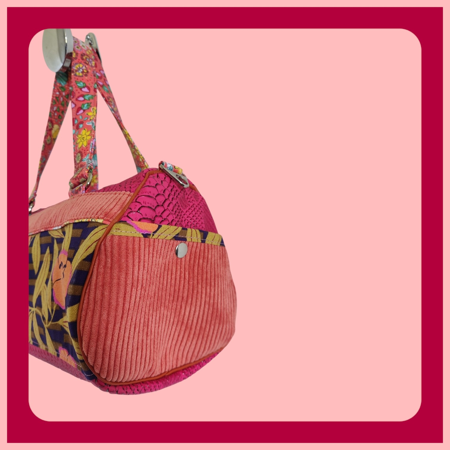 Un mélange de textures… et d’audace. Simili cuir croco rose fuchsia, velours côtelé corail tout doux, une toile d’ameublement fleurie et géométrique aux accents violet, corail et vert tilleul … sans oublier une toile enduite aux airs de plage, entre coquillages et flamants roses.